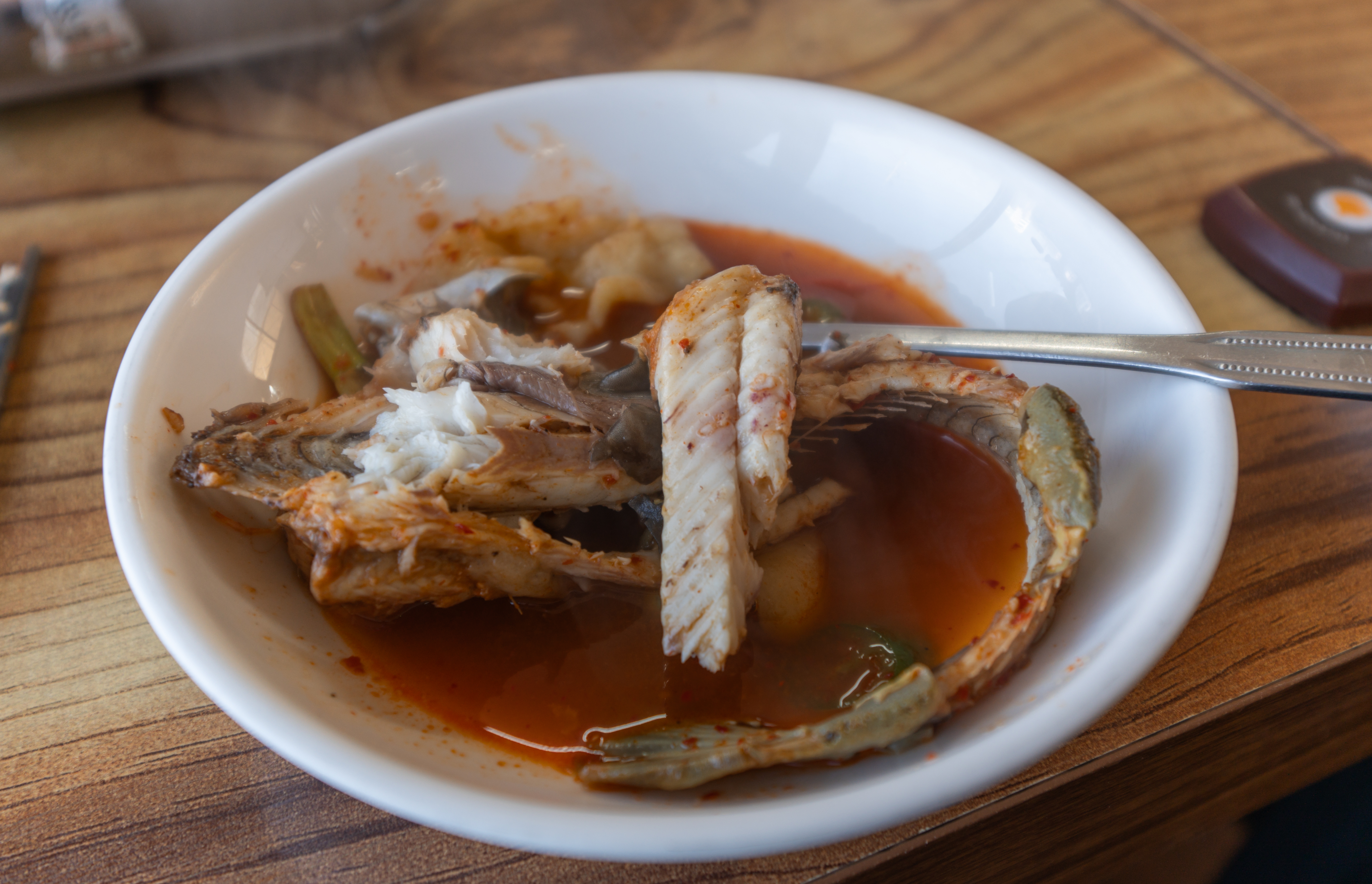 본 메뉴인 메기매운탕도 여러차례 먹었지만, 흙내 없이 맛있었습니다. 특히 메기 식감이 흐물흐물거리지 않고 적당히 식감이 탄력이 있어서 괜찮더라고요. 메기매운탕에는 수제비와 민물새우 팽이버섯 등이 들어가 국물도 시원하고 맛있었습니다.