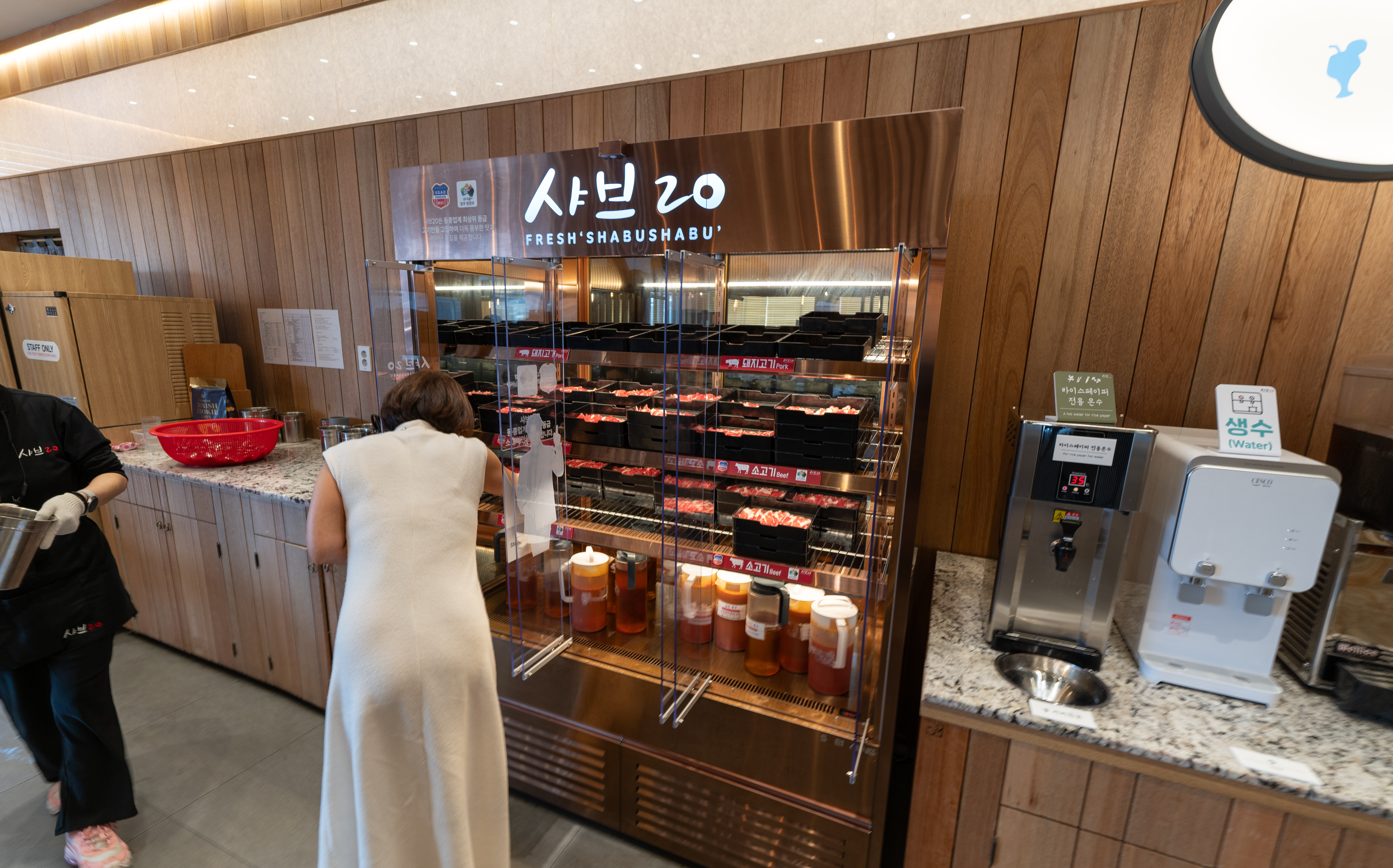 샤브20 송파감일점의 셀프코너에서는 샤브샤브용 고기와 채소 등을 담아 올 수 있었습니다. 샤브샤브용 고기는 소고기, 돼지고기 두 종류가 있었고, 배추, 청경채, 호박, 숙주, 대파, 버섯 등 샤브샤브용 채소들과 월남쌈에 들어가는 채소들 그리고 샤브샤브나 월남쌈에 곁들일 소스들을 기호에 맞게 가져올 수 있었습니다.
