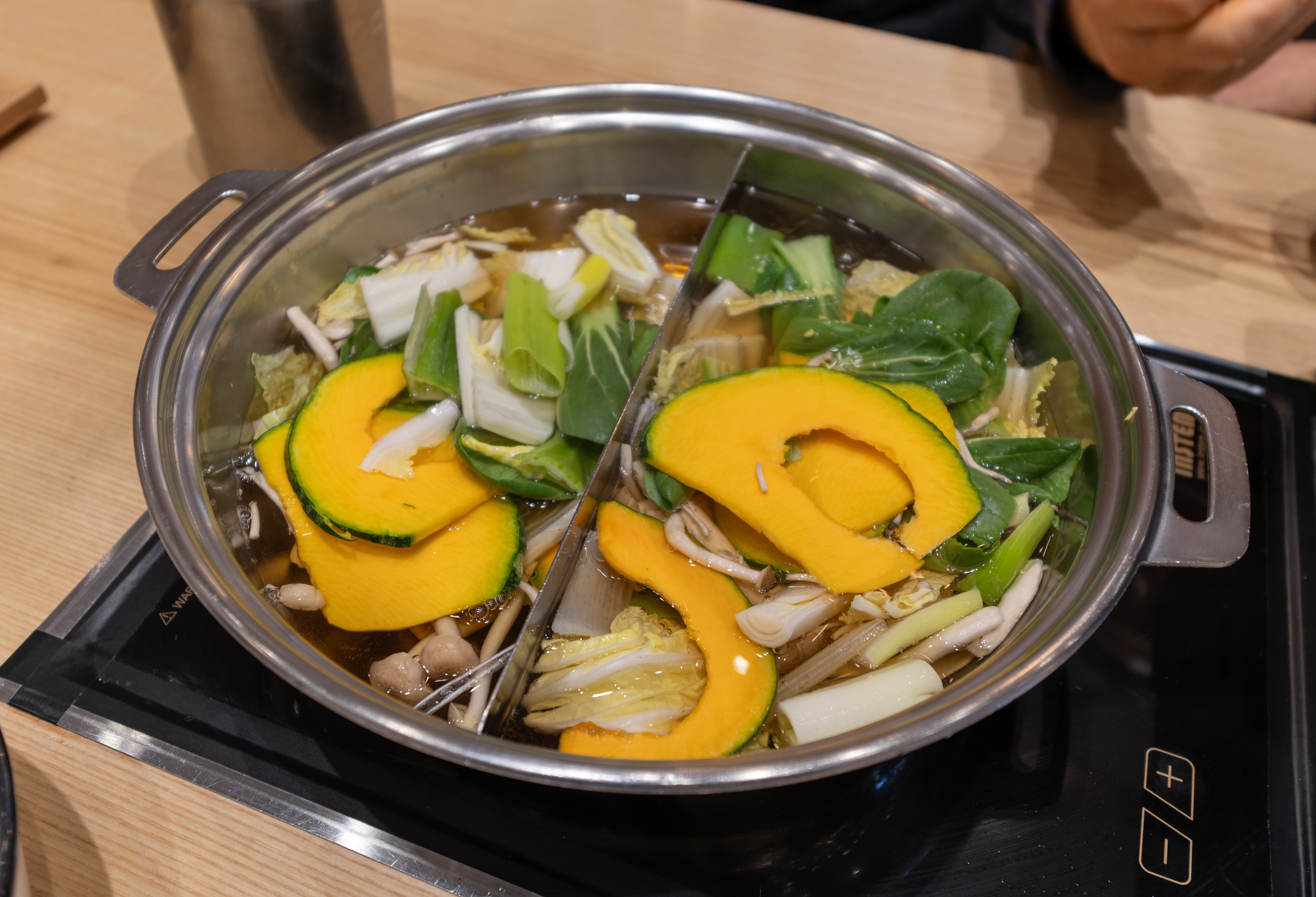 샤브샤브 전골냄비에 육수를 끓여주고, 배추와 청경채, 단호박, 대파 등 각종 채소들을 넣어준 뒤 소고기를 적당량 덜어서 넣어줍니다. 소고기를 너무 많이 넣으면 뭉쳐서 오히려 뻣뻣해질 수 있으니, 조금씩 펼쳐서 국물에 넣어 익혀줍니다.