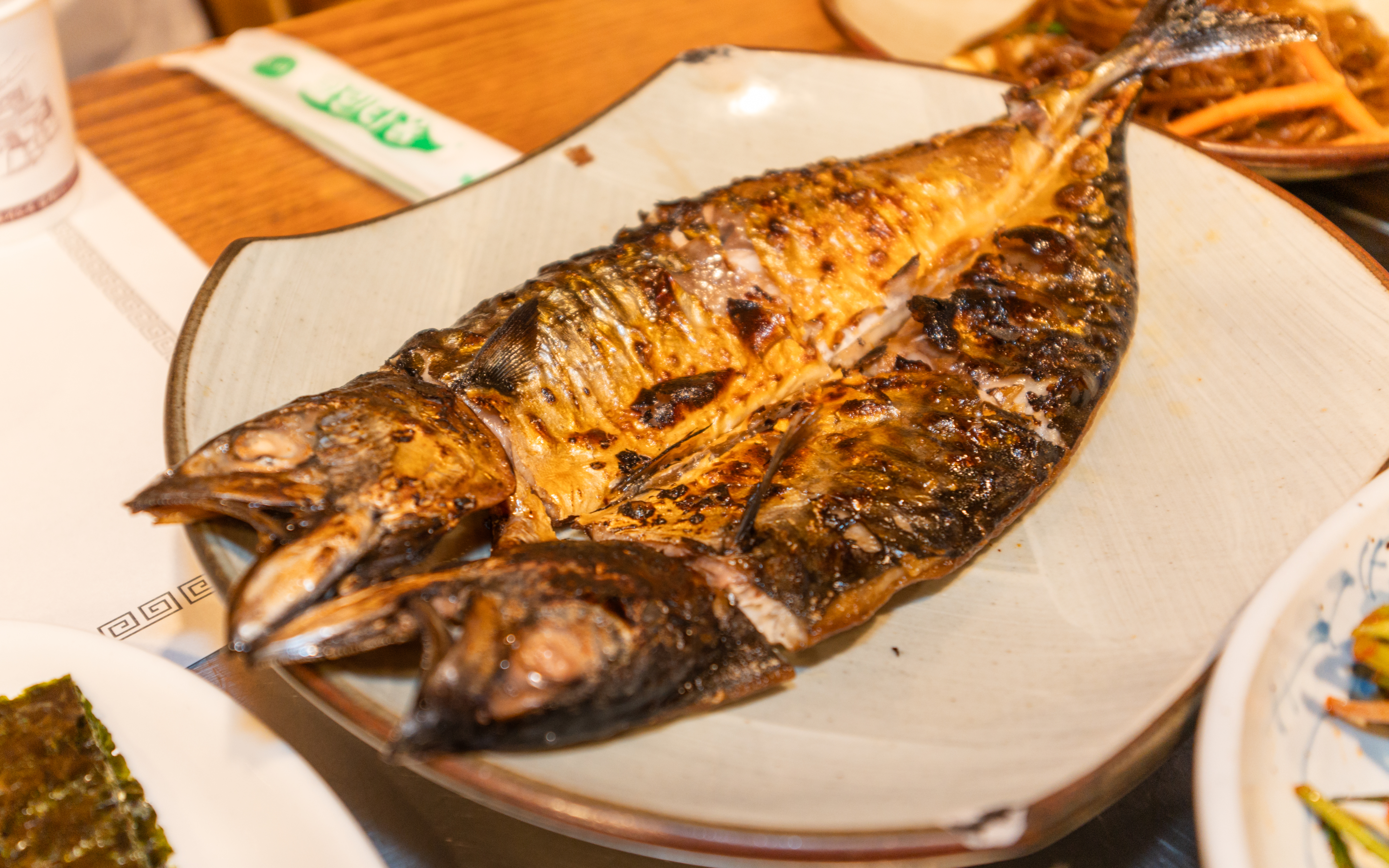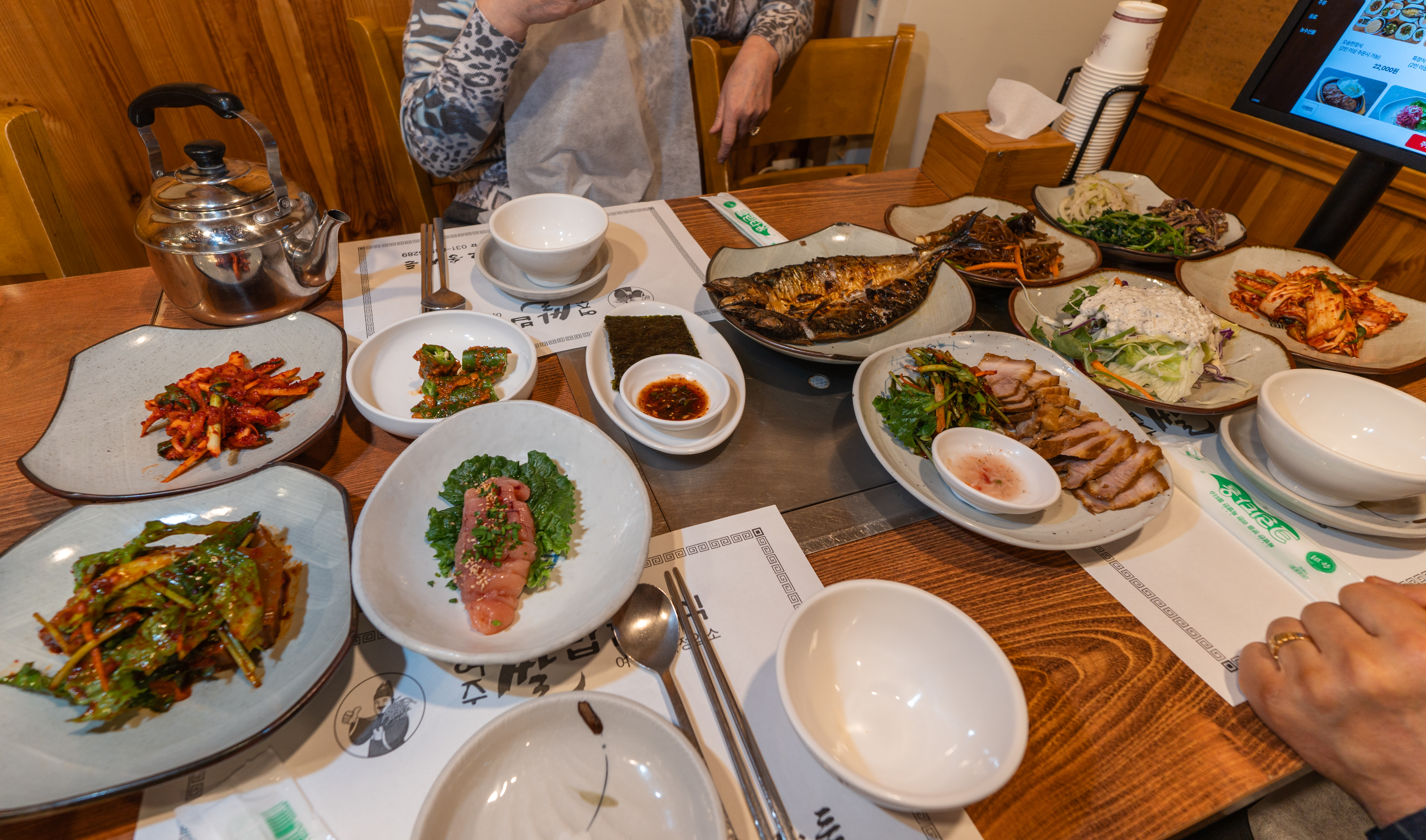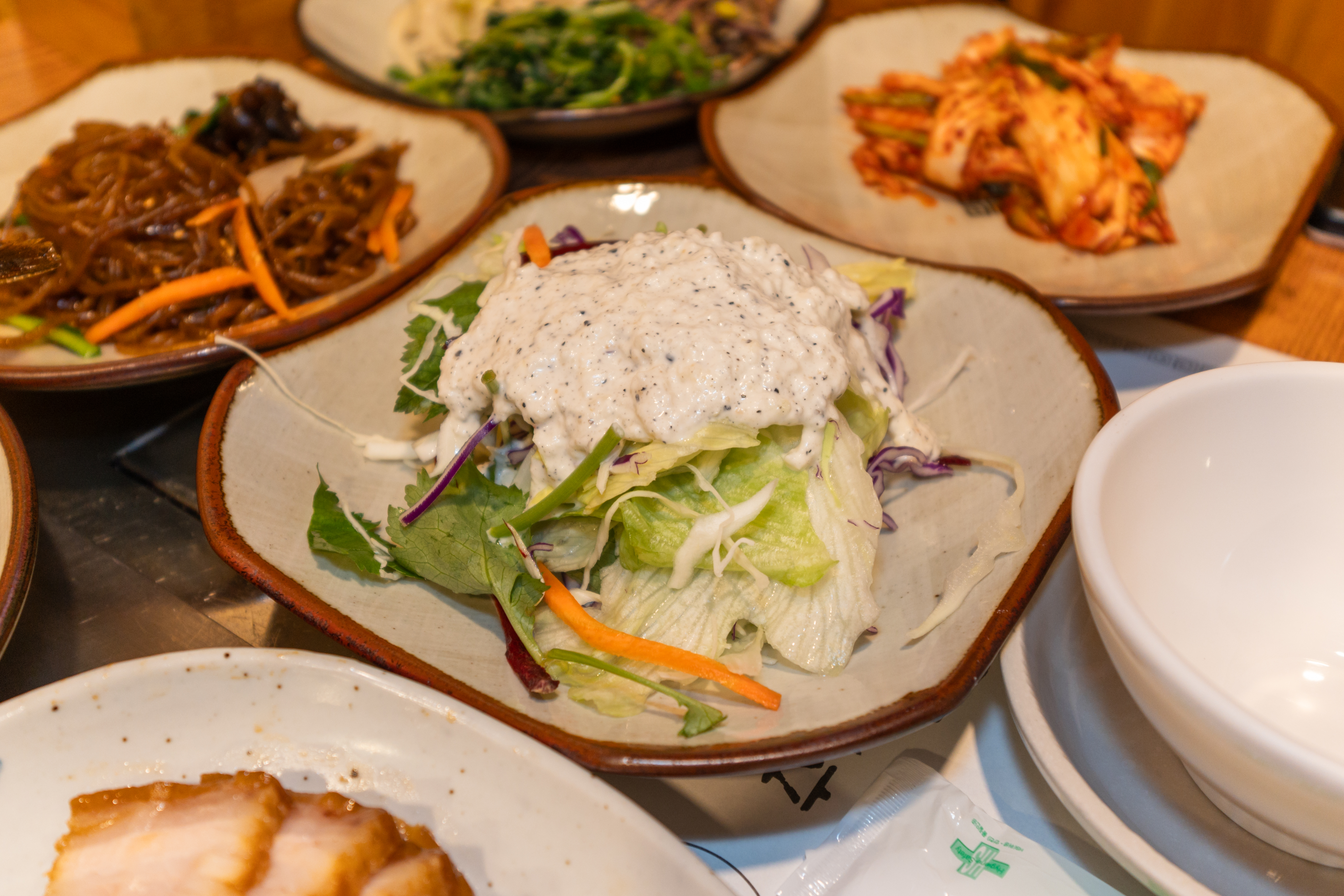 오송한정식의 반찬은 위와 같이 나왔습니다. 명란젓과 각종 무침류 그리고 김과 간장 생선구이와 샐러드, 잡채와 배추김치, 나물무침이 함께 제공되었습니다. 반찬은 대부분의 한정식집과 동일하게 정갈하게 잘 나오고 있었습니다.