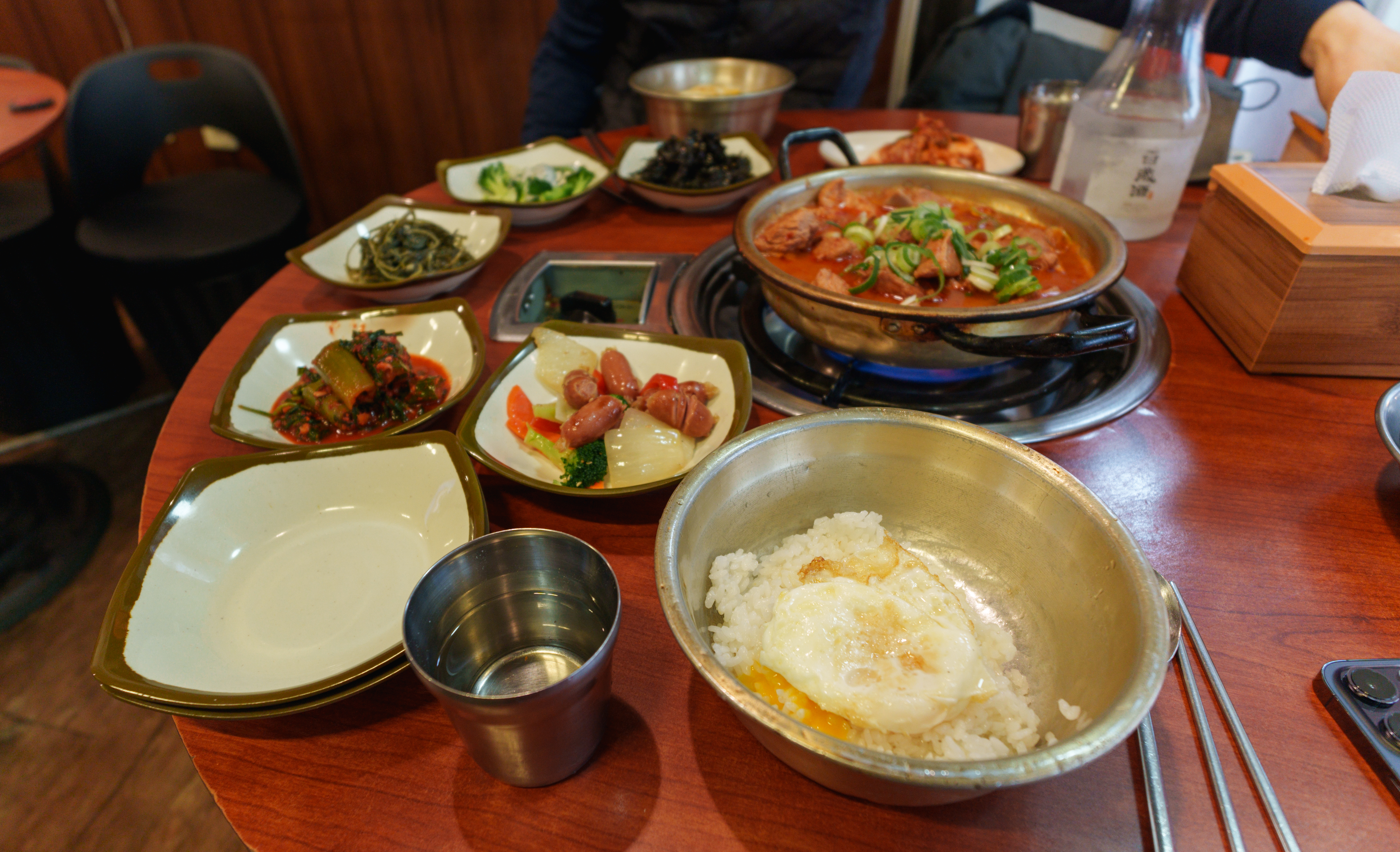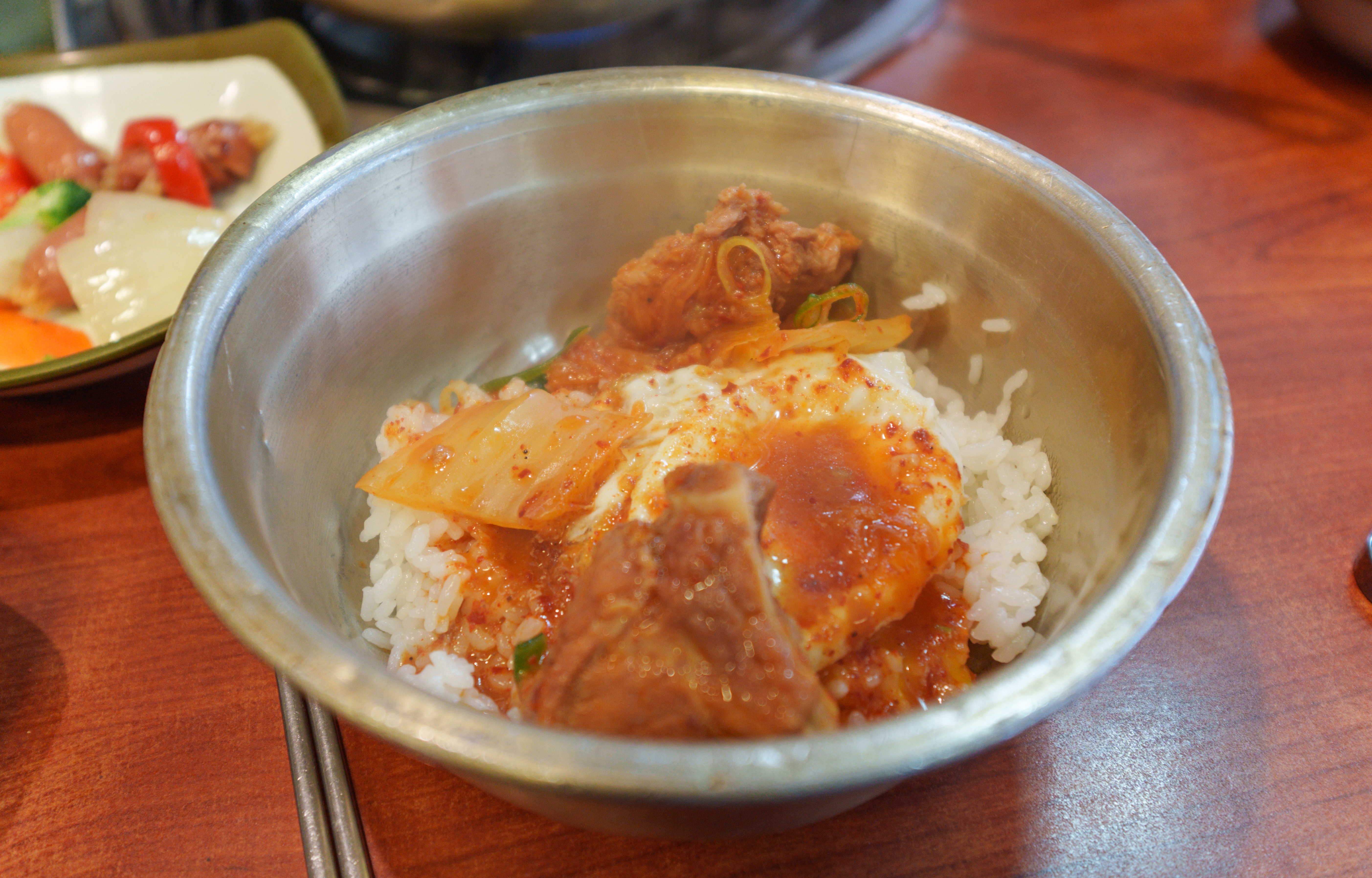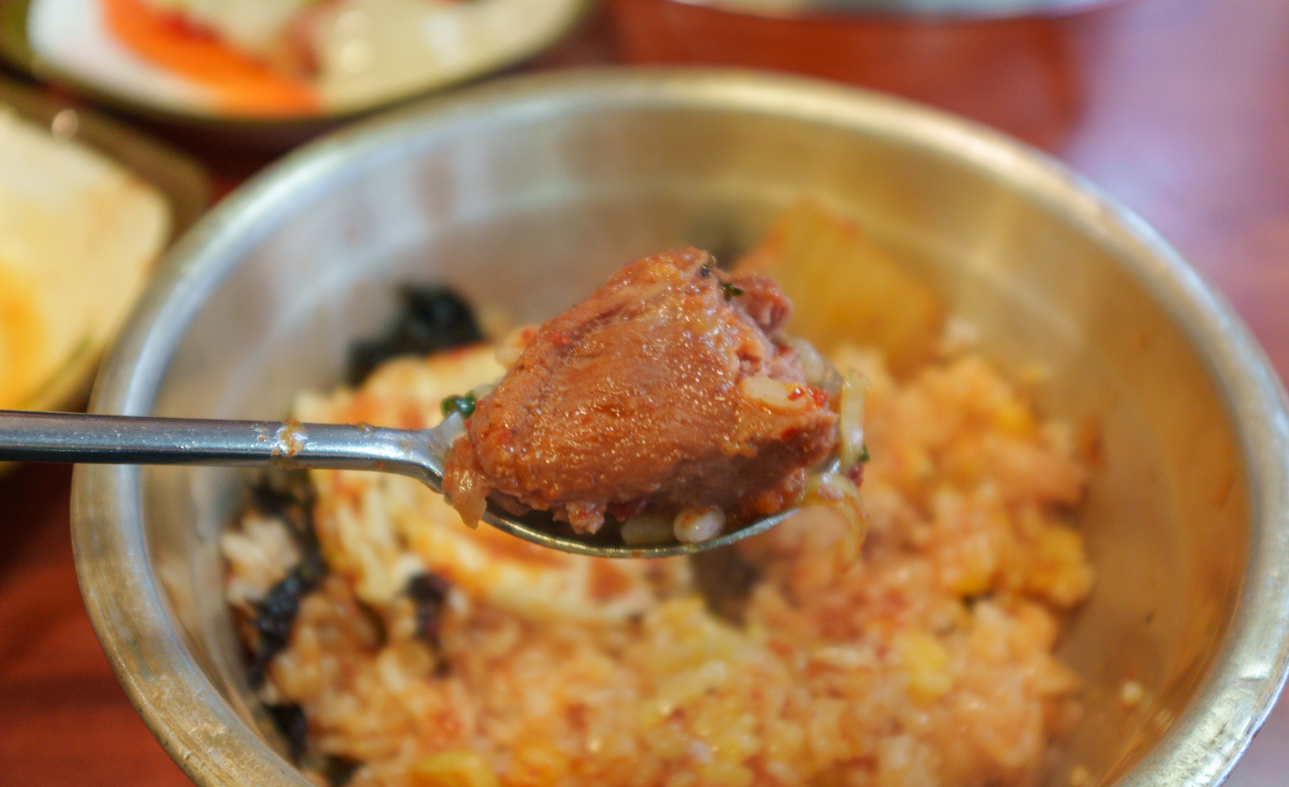 매운 갈비찜은 위와 같이 양푼 냄비에 제공되고 있었습니다. 달걀프라이 밥에 슥슥 비벼먹으면 되었는데요, 파래자반이랑 양푼 그릇에 넣고 비벼서 먹으면 되었습니다. 매운갈비김치찜의 맛은 김치찜이나 짜글이 느낌(?)과도 비슷했습니다. 조금 단 맛이 강하긴 했는데, 무난하게 먹을만 했습니다.
