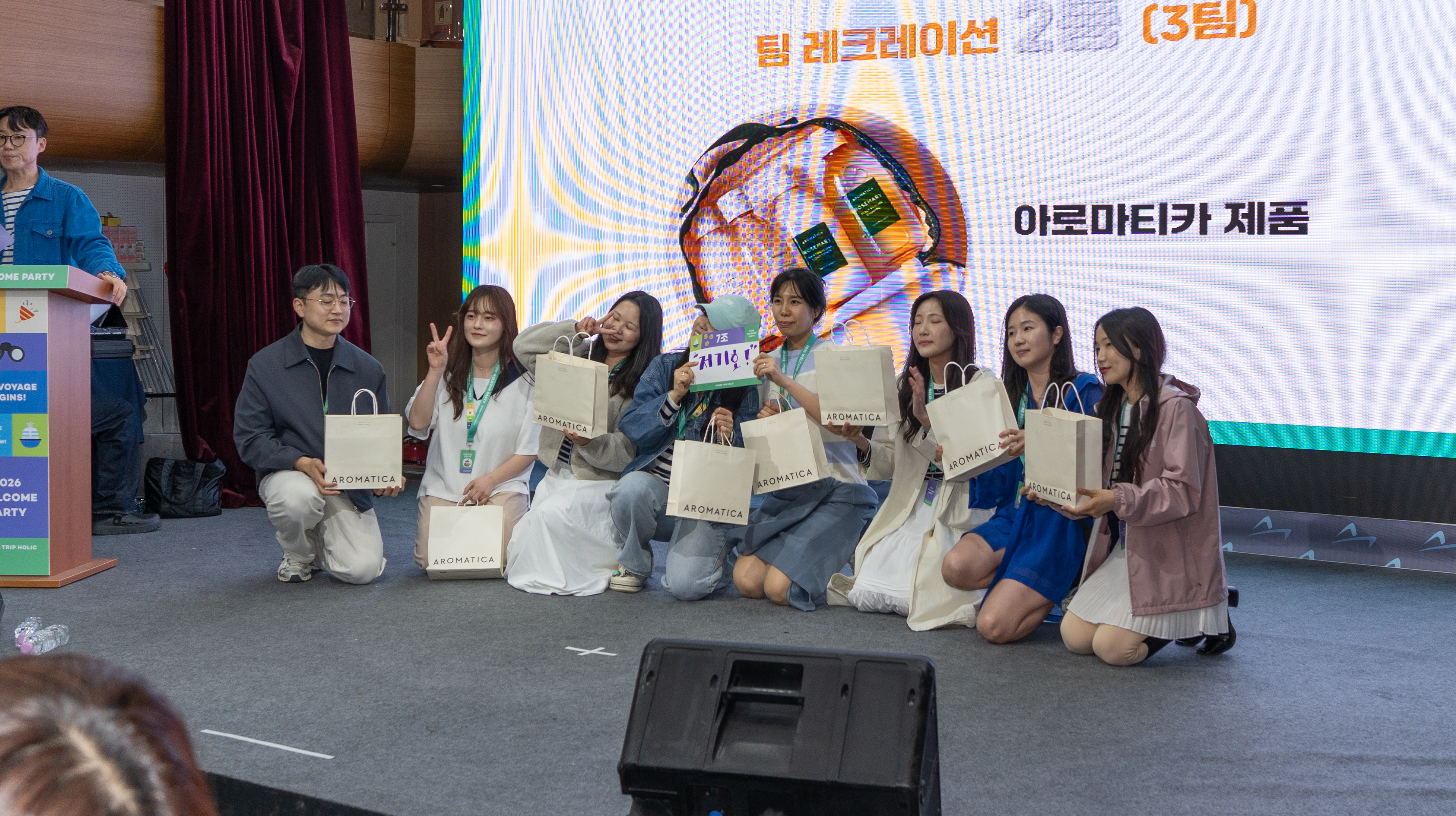 이후 2등과 3등 베스트팀워크, 베스트시너지상 순으로 시상식이 진행되었습니다. 2등 상품은 아로마티카 제품, 3등은 멜리언스 여행용 멀티어댑터, 베스트팀워크 상품은 브리타 정수 텀블러, 베스트 시너지 상품은 캡슐세제, 여행용파우치, 러쉬입욕제 선물이 있었습니다. 하지만 이번 웰컴파티에서는 큰 상품을 몰아주고 있었는데요,