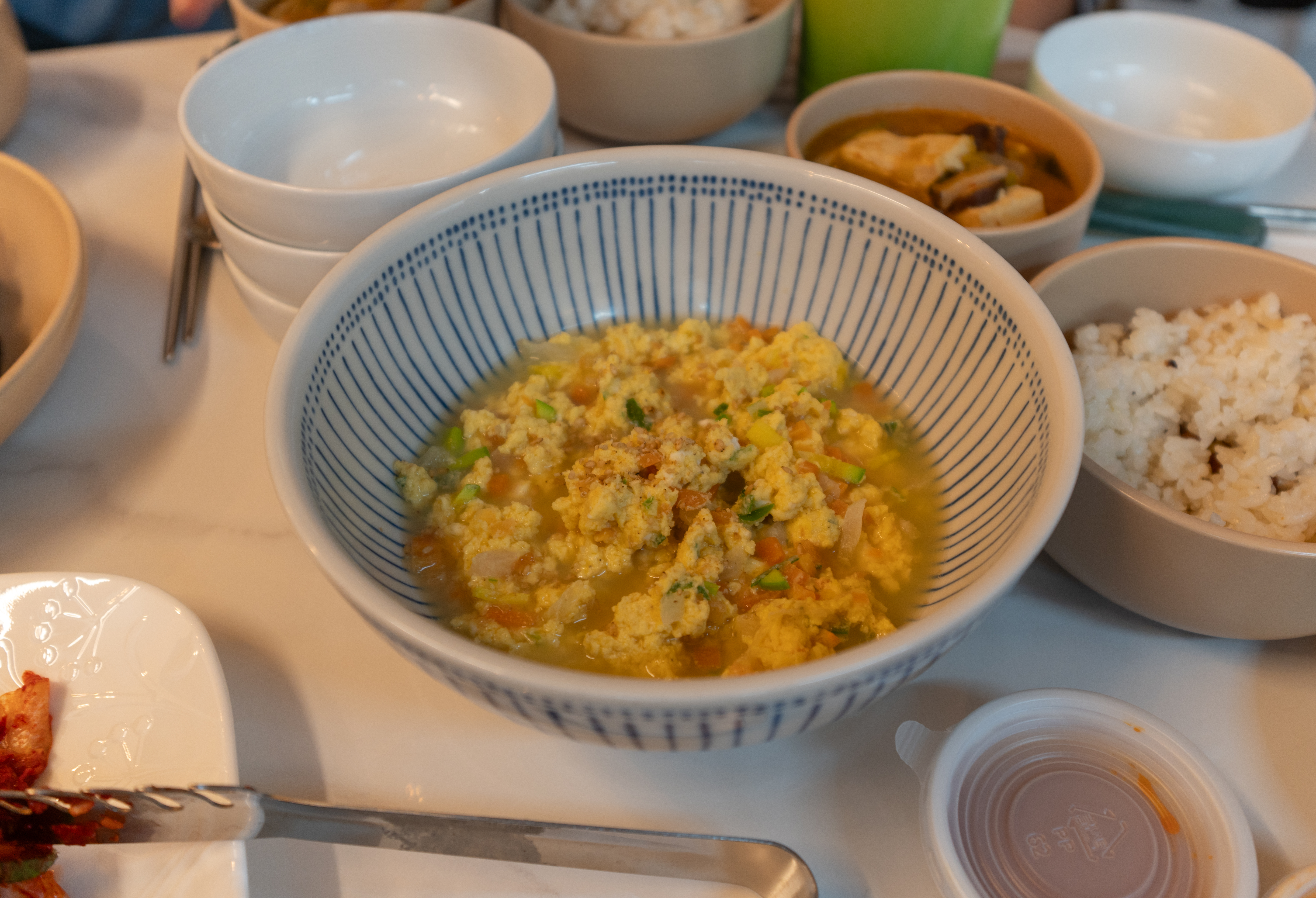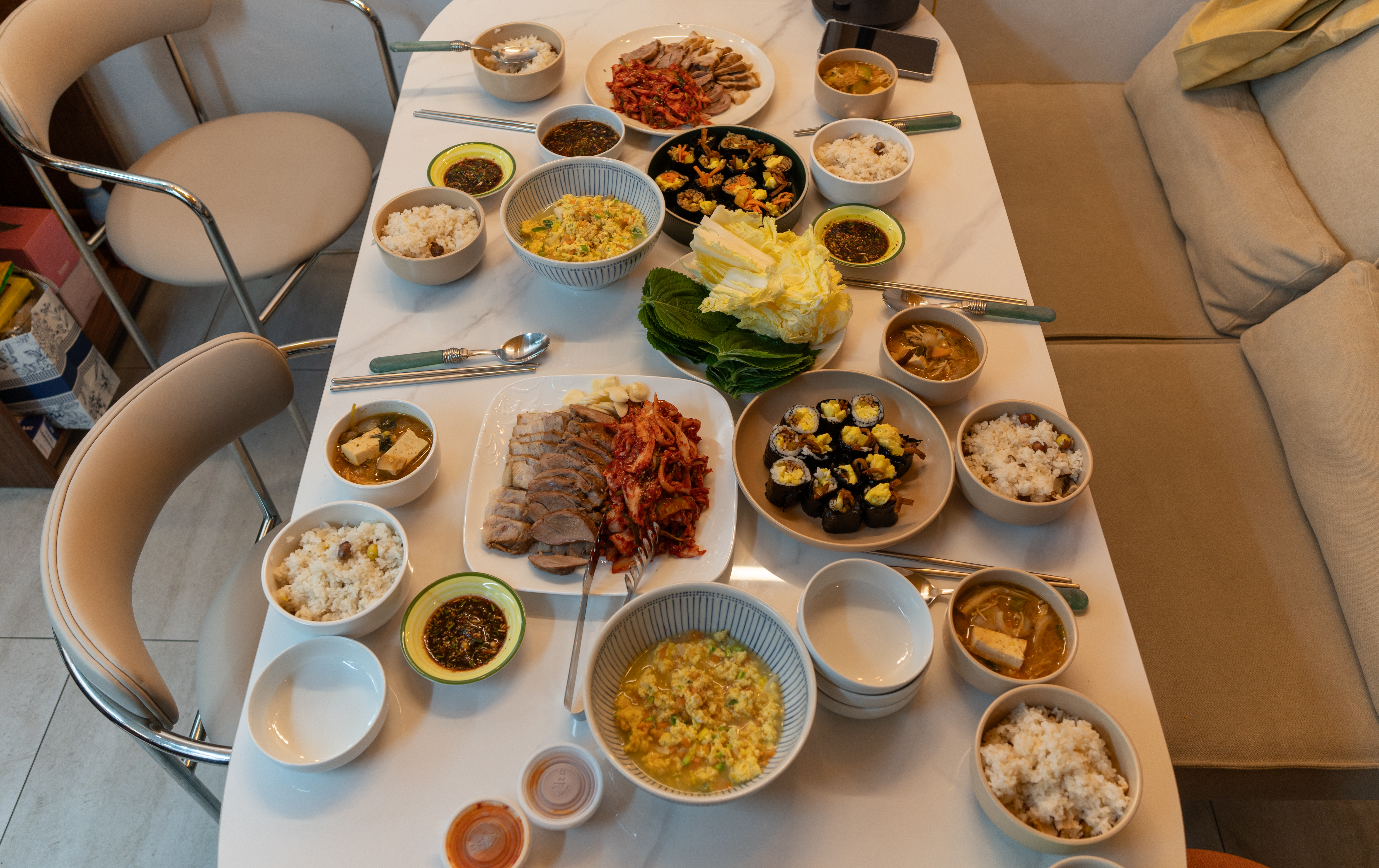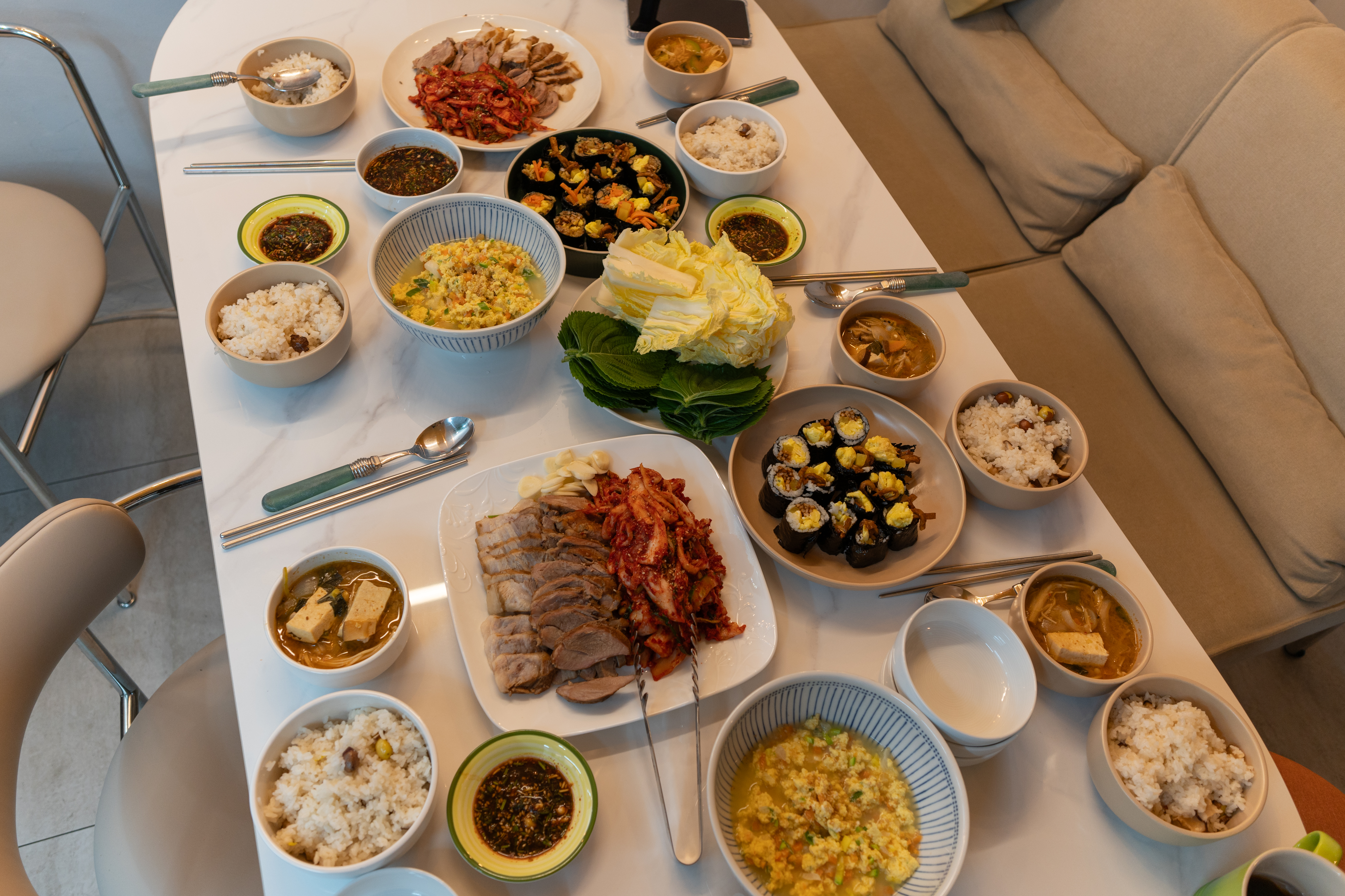 함께어때에서 함께 준비한 저녁식사가 준비되었습니다. 버섯, 은행이 들어간 밥과 달래장 그리고 맑고 시원하게 끓여 낸 된장찌개, 주안동서재응님이 중간에 포장해 오신 수육과 김치, 송송 썬 파와 당근이 들어간 달걀찜, 직접 준비 해오신 김밥 등 건강하고 맛있는 저녁 식사가 준비되었습니다.