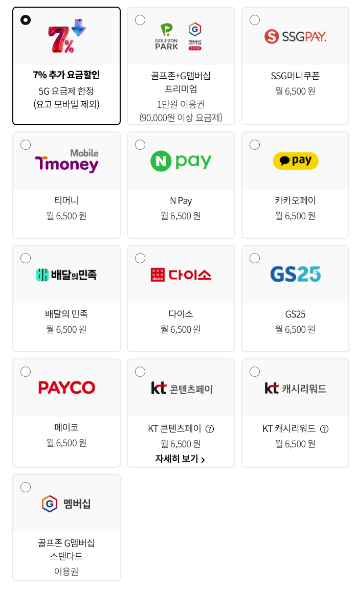 요금제는 제가 이전에 소개해드린 요고 인터넷 부터, 5G, LTE 등 여러가지 옵션을 넣어 본인에게 최적의 요금제를 선택할 수도 있었습니다. 유튜브프리미엄, 티빙, 지니, 밀리, 폰케어, 디바이스, 넷플릭스, 디즈니+, 가전구독, 위버스 등 OTT 구독이나, 가전구독 등 저 또한 구독형 서비스를 여러 개 이용하고 있는데, 따로따로 결제하는 것보다 이렇게 휴대폰 요금으로 관리하면 더 편리한 부분도 있는 것 같습니다.