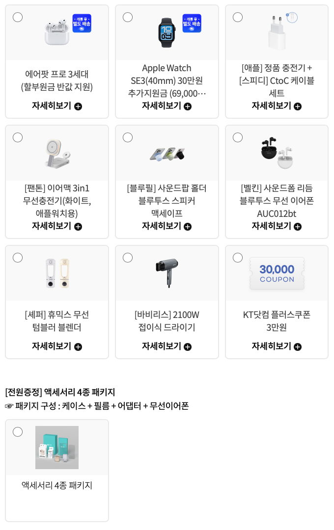 지인들이 다들 아이폰 17 프로로 기변을 하면서, 아이폰 14 프로를 쓰고 있는 저도 KT 닷컴으로 아이폰 17 프로를 한 번 알아보았습니다. 각자 상황에 따라 저렴한 요금제부터 프리미엄 요금제까지 선택할 수 있는 폭이 넓어 좋았습니다. 현재 에어팟 프로 3, 애플워치 SE 3 같은 경우 기기값의 일부를 지원해주고 있었고, 구매 후기만 작성해도 에어태그를 주고 있다고 합니다. 게다가 아이폰 저장공간과 별개로 아이클라우드 쓰면 참 편하죠. 여러분도 부담 없이 올려드린 링크로 구경해 보시면 좋을 것 같아요.
