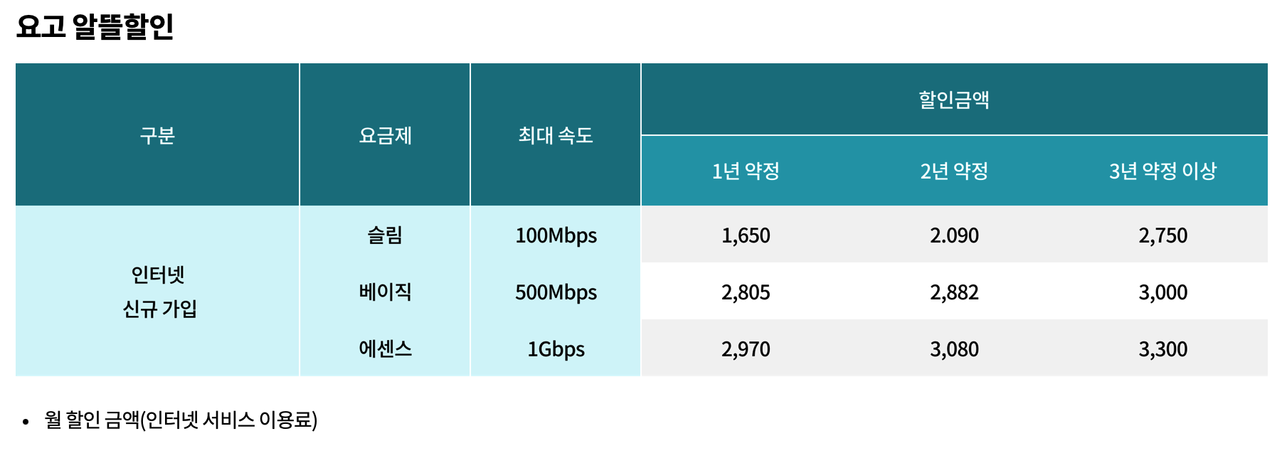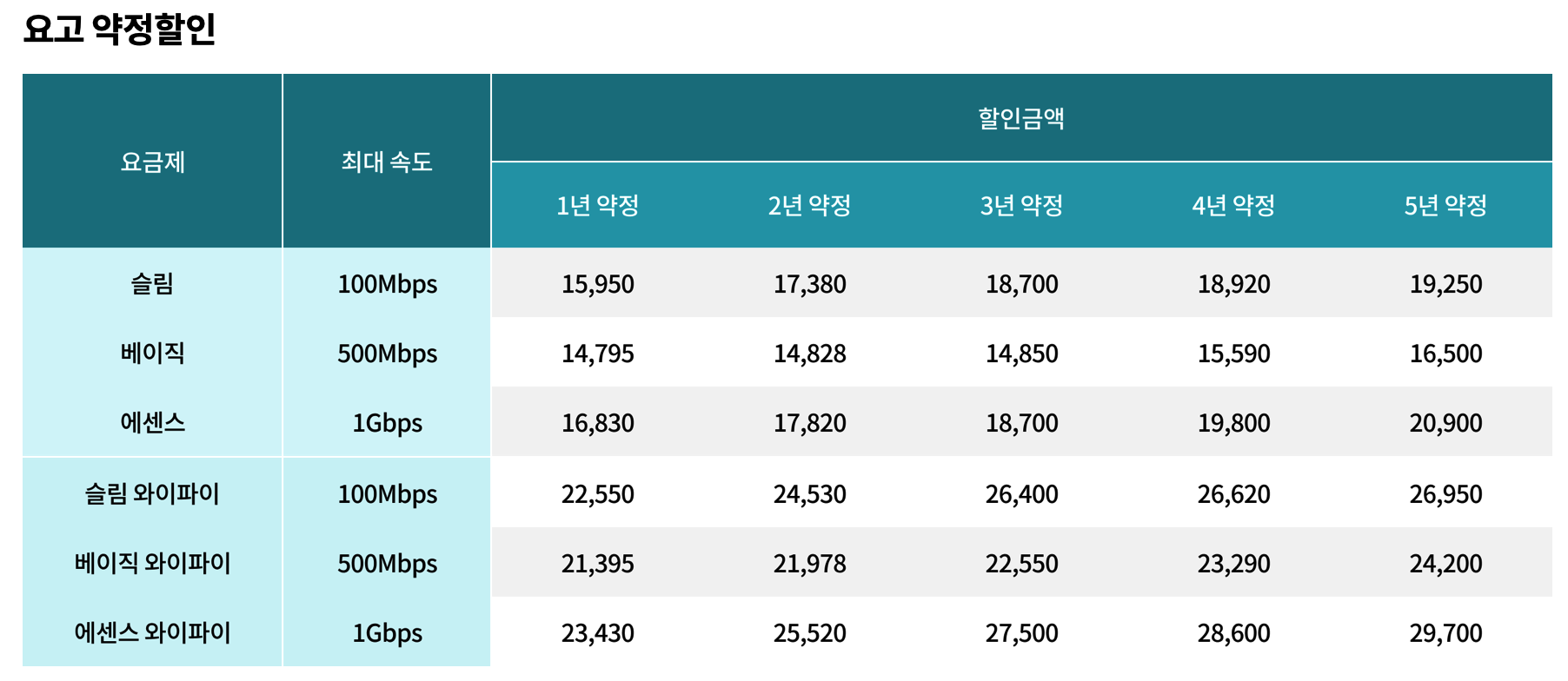 KT 요고 인터넷 장점중 하나는 1년부터 5년까지 본인 상황에 맞게 약정 기간을 정할 수 있다는 점인데요. 오래 유지할수록 할인 금액이 커지는 것은 다들 알고 계시죠? 인터넷 신규 가입 에센스 1Gbps 기준 1년 약정 시 2,970원이라면, 3년 약정 이상은 3,300원 할인이 적용되는 방식이죠.