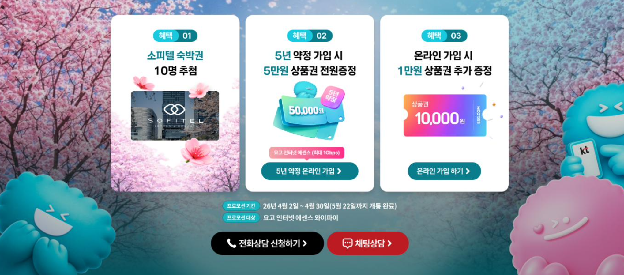 참고로, 요고 인터넷 출시 프로모션으로 추첨을 통해 소피텔 숙박권이나, 5년 약정 가입 고객 전원 5만 원 상품권 증정 및 온라인 가입 시 1만 원 상품권 추가 증정이 있다고 합니다. 기한은 26년 4월 2일부터~ 4월 30일 까지라고 합니다. 자세한 사항은 아래 링크를 통해 확인해 보실 수 있습니다.